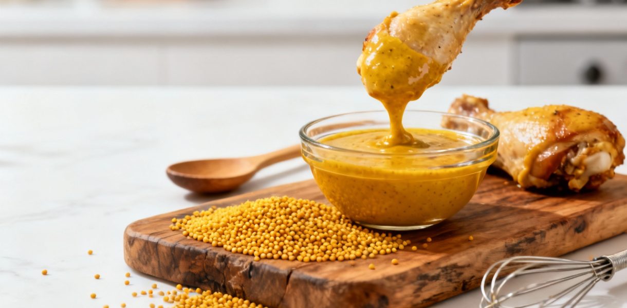 La réussite de cette recette réside dans le choix de la moutarde. Privilégiez une moutarde de Dijon forte qui apportera du caractère sans masquer le goût du poulet. Vous pouvez également mélanger moutarde forte et moutarde à l’ancienne pour varier les textures.